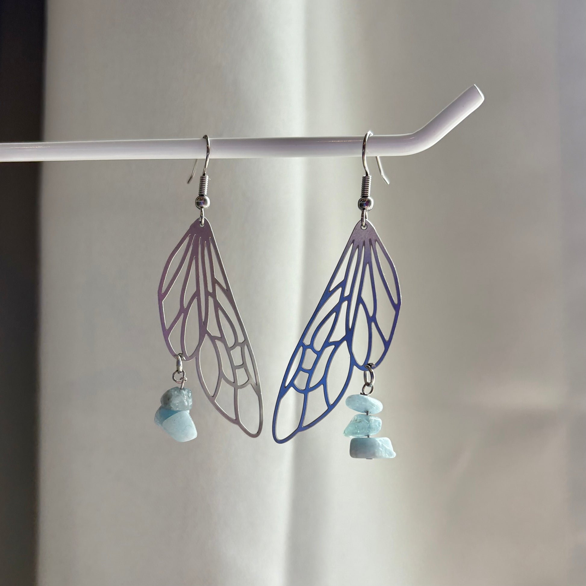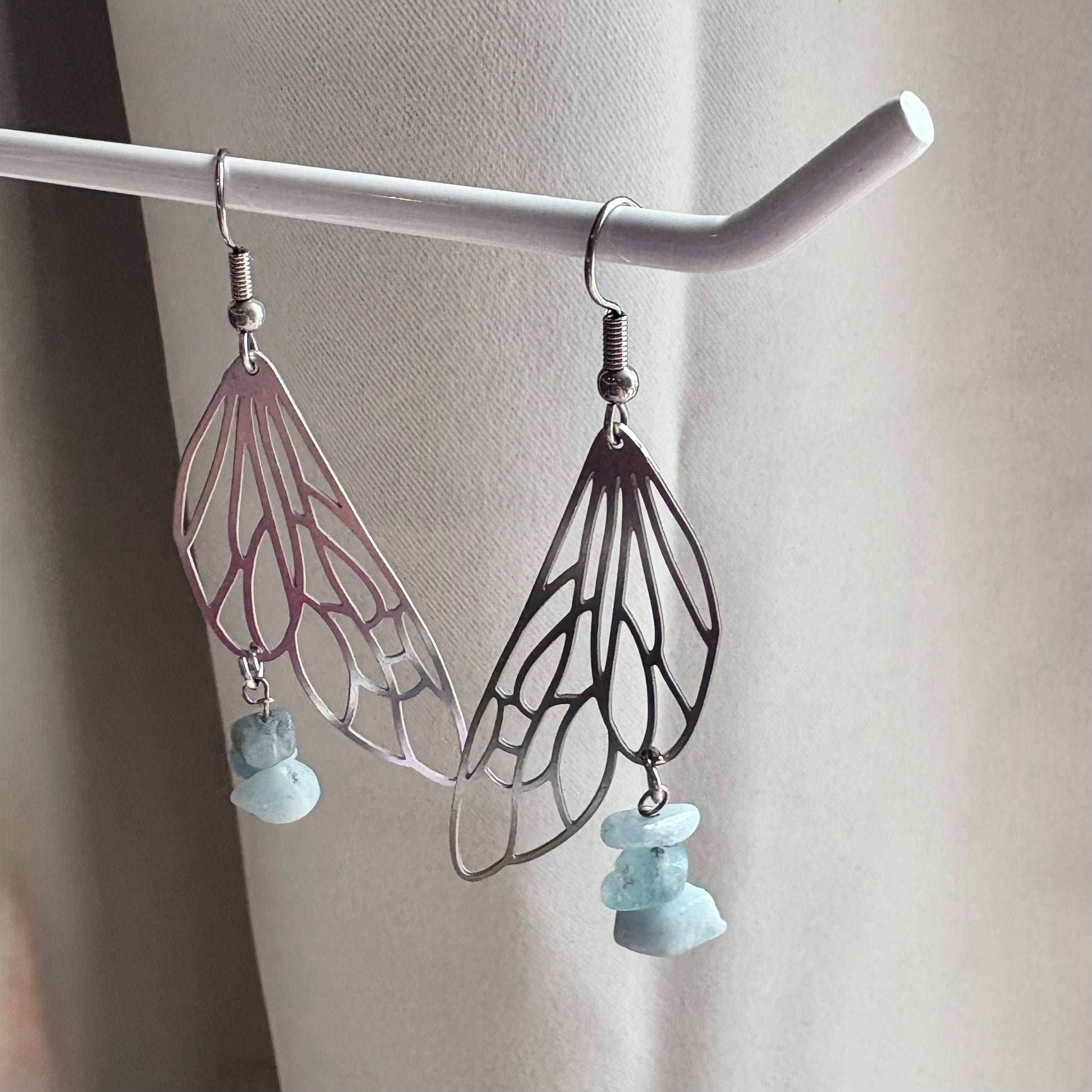 Stainless steel silver fairy wing dangle earrings with blue aquamarine crystals