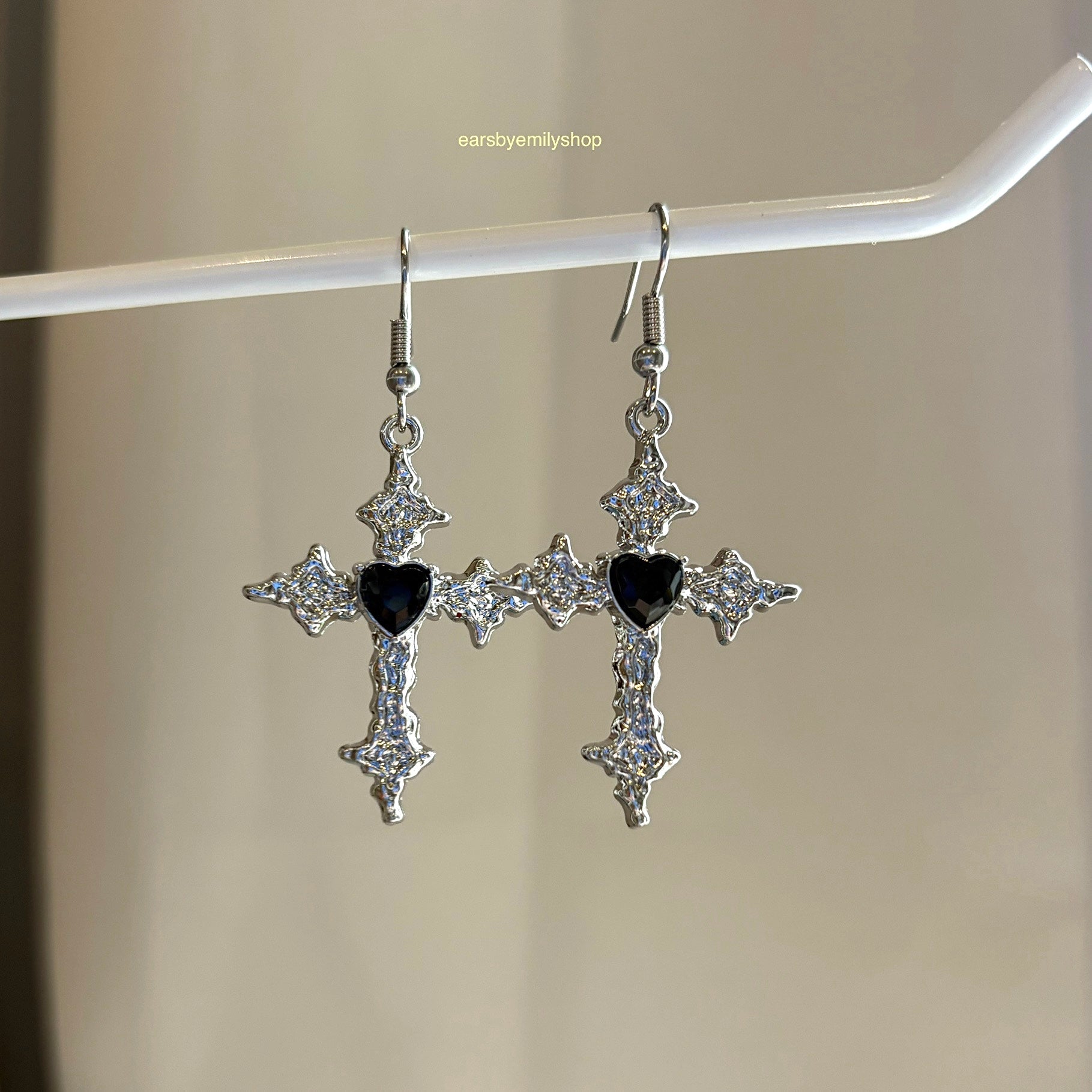 Cool silver with black heart cross drop dangle earrings on hypoallergenic surgical steel hooks