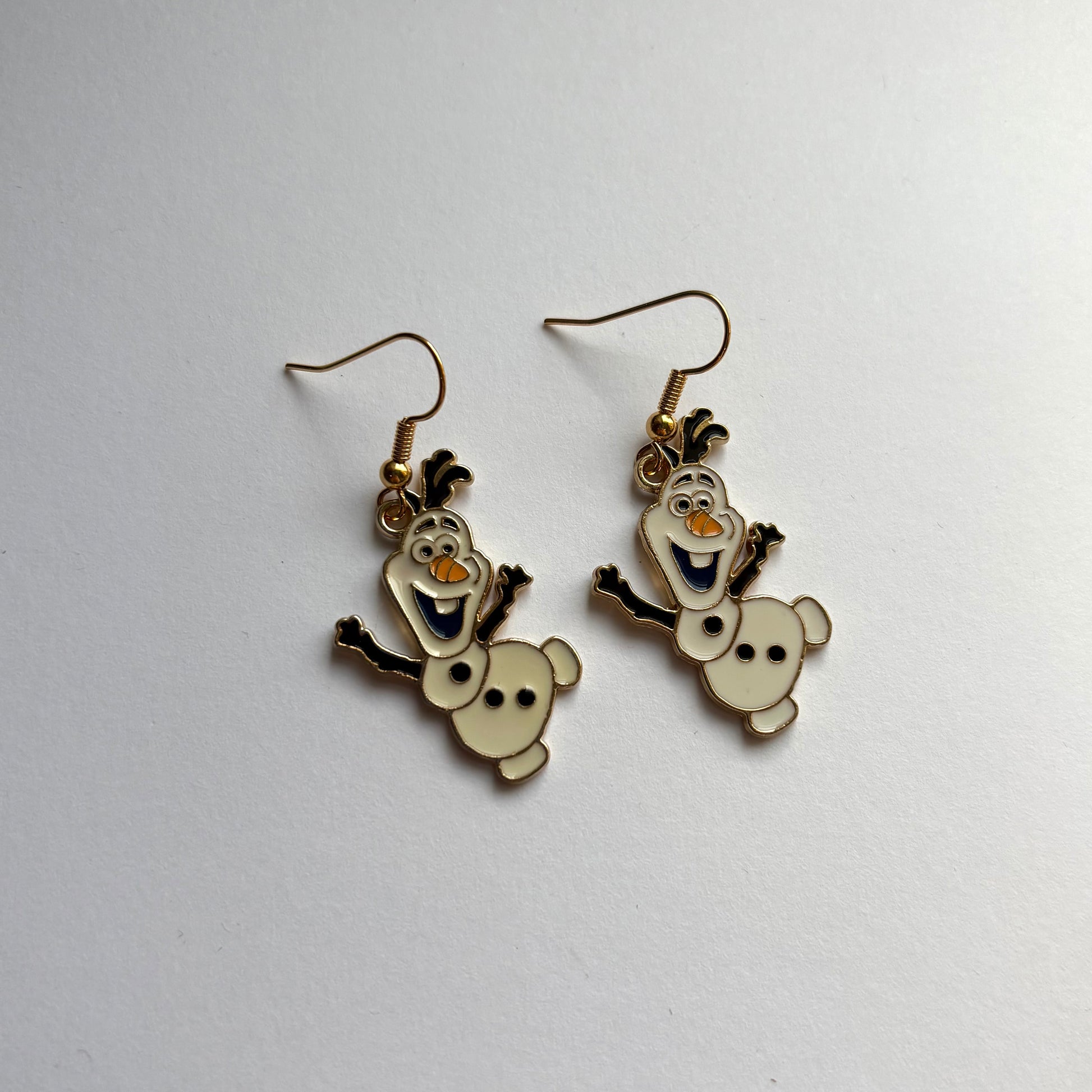 A cute pair of cartoon snowman dangle earrings. On a pair of nickel free gold plated hooks