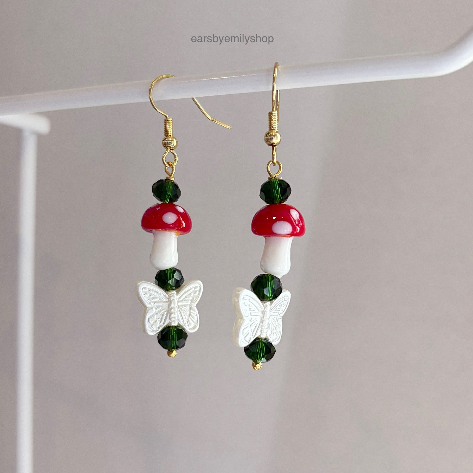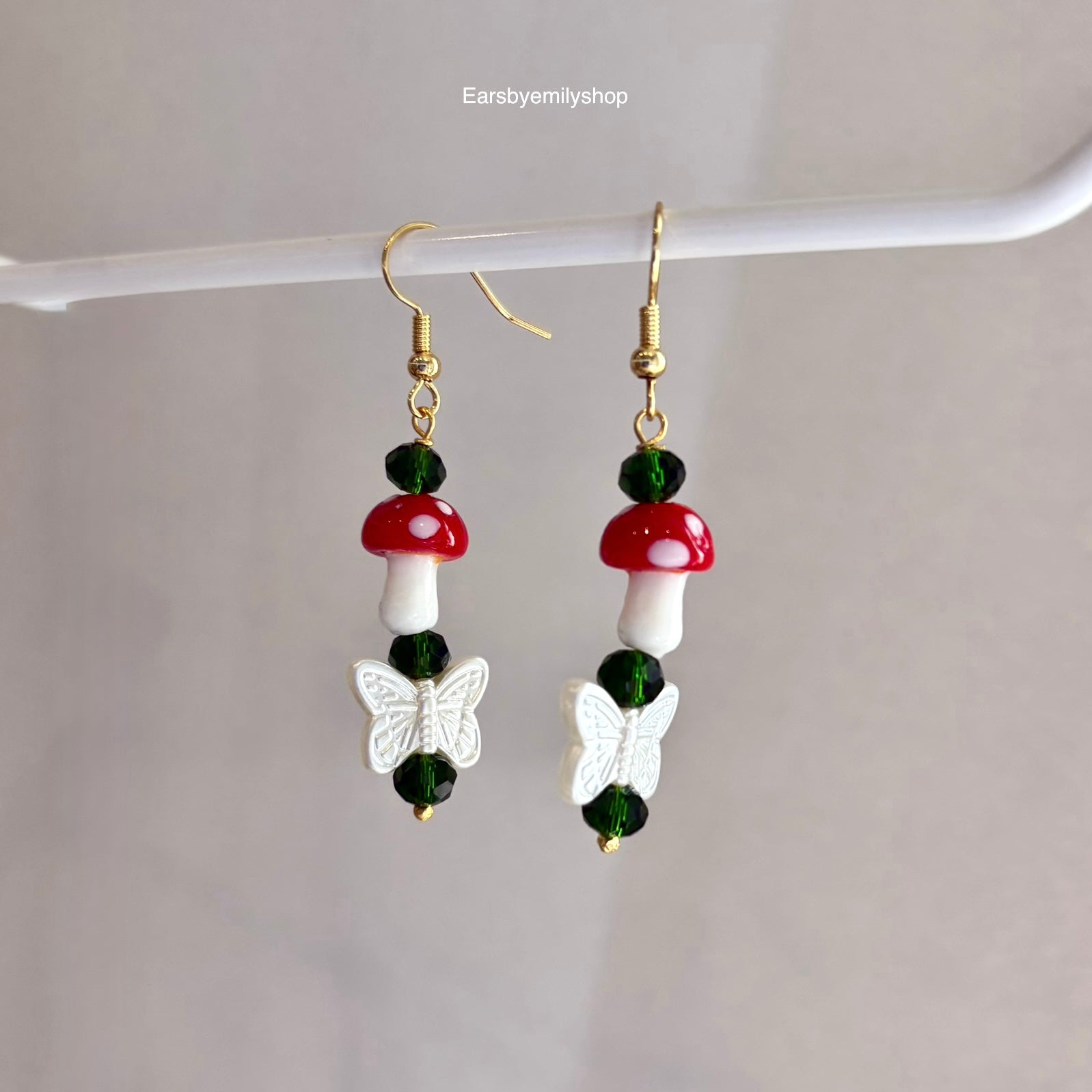 Add a whimsical touch to your look with these gold-plated dangle earrings featuring playful white butterflies, vibrant red glass lamp-work mushrooms, and fresh green beads. Handmade with care, they bring a splash of nature-inspired charm that’s perfect for anyone who loves a little fun and flair in their accessories.