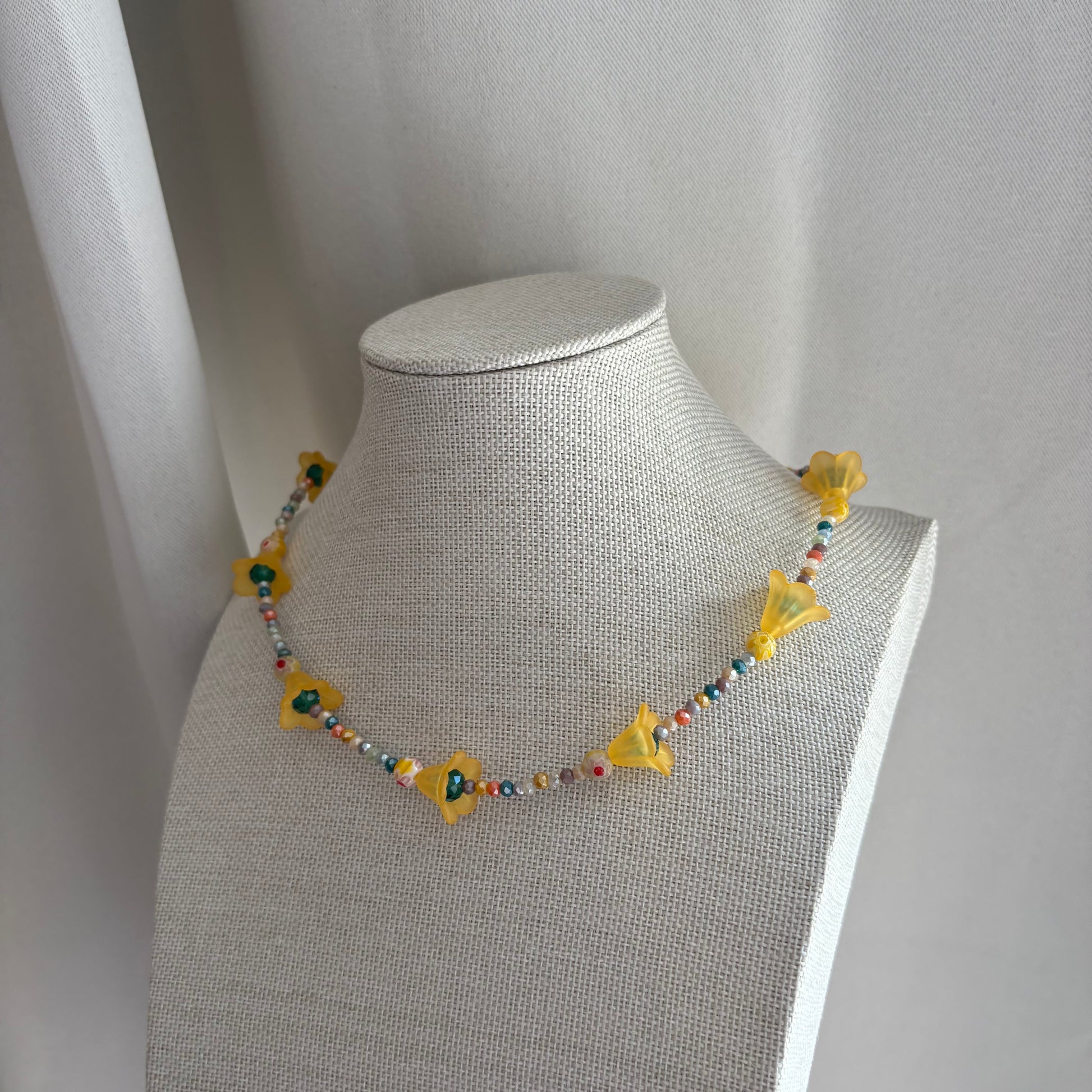 Add a pop of playful charm to your look with this handmade beaded choker necklace, featuring vibrant yellow/ orange flower beads and a splash of colorful whimsy. Inspired by fantasy, it’s finished with a stainless steel extender chain for a perfect fit that feels as magical as it looks.
