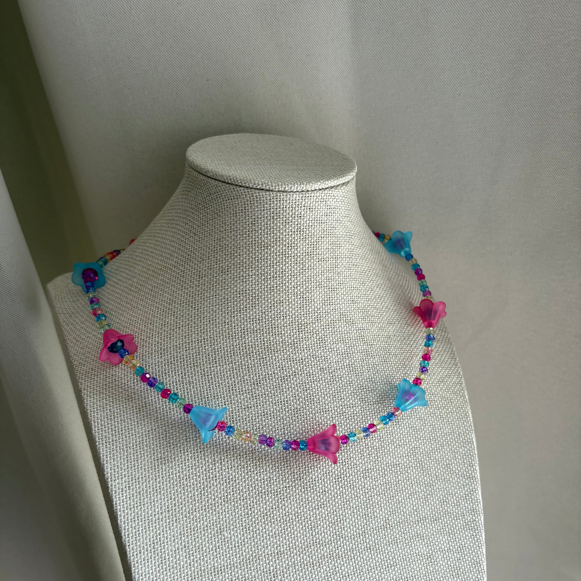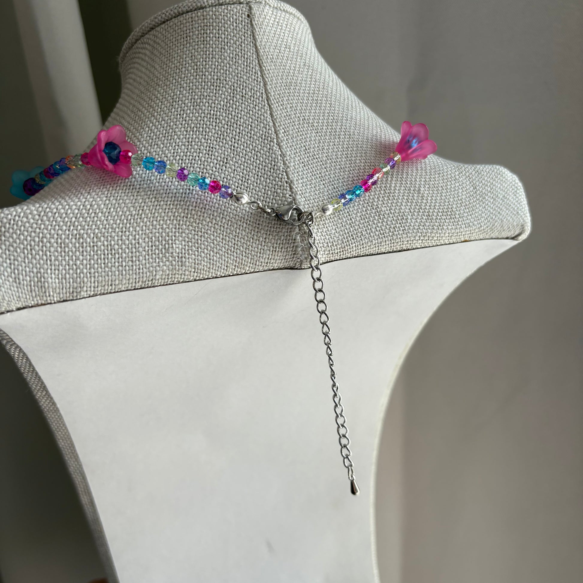 This playful handmade choker necklace dazzles with bright blue and pink flower-shaped beads, inspired by fantasy worlds. Its vibrant colors and intricate design bring a fun, magical vibe to any outfit. Finished with a stainless steel extender chain, it offers an adjustable and comfortable fit to suit your style.