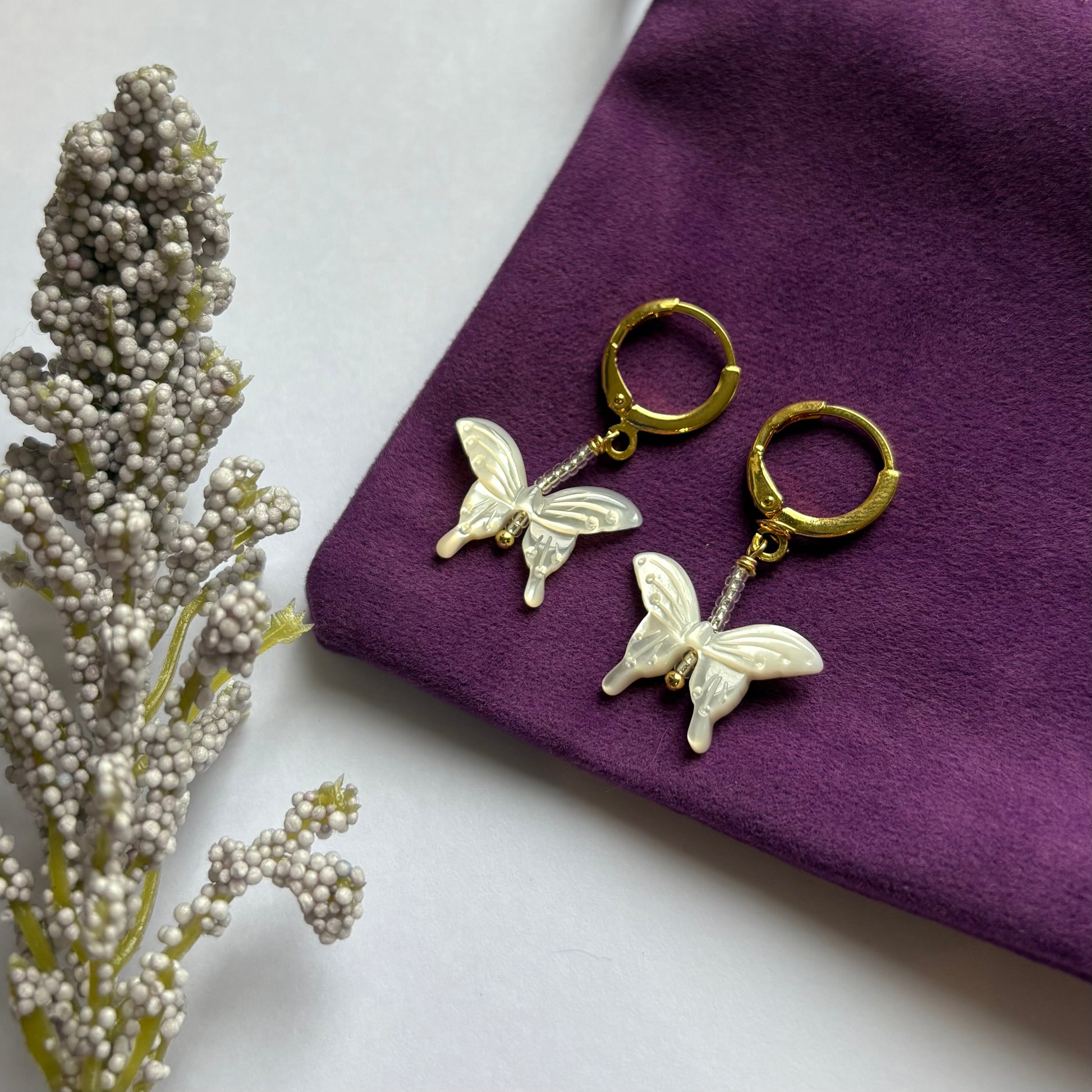 Mother of pearl beaded butterfly drop dangle gold plated huggie hoop earrings