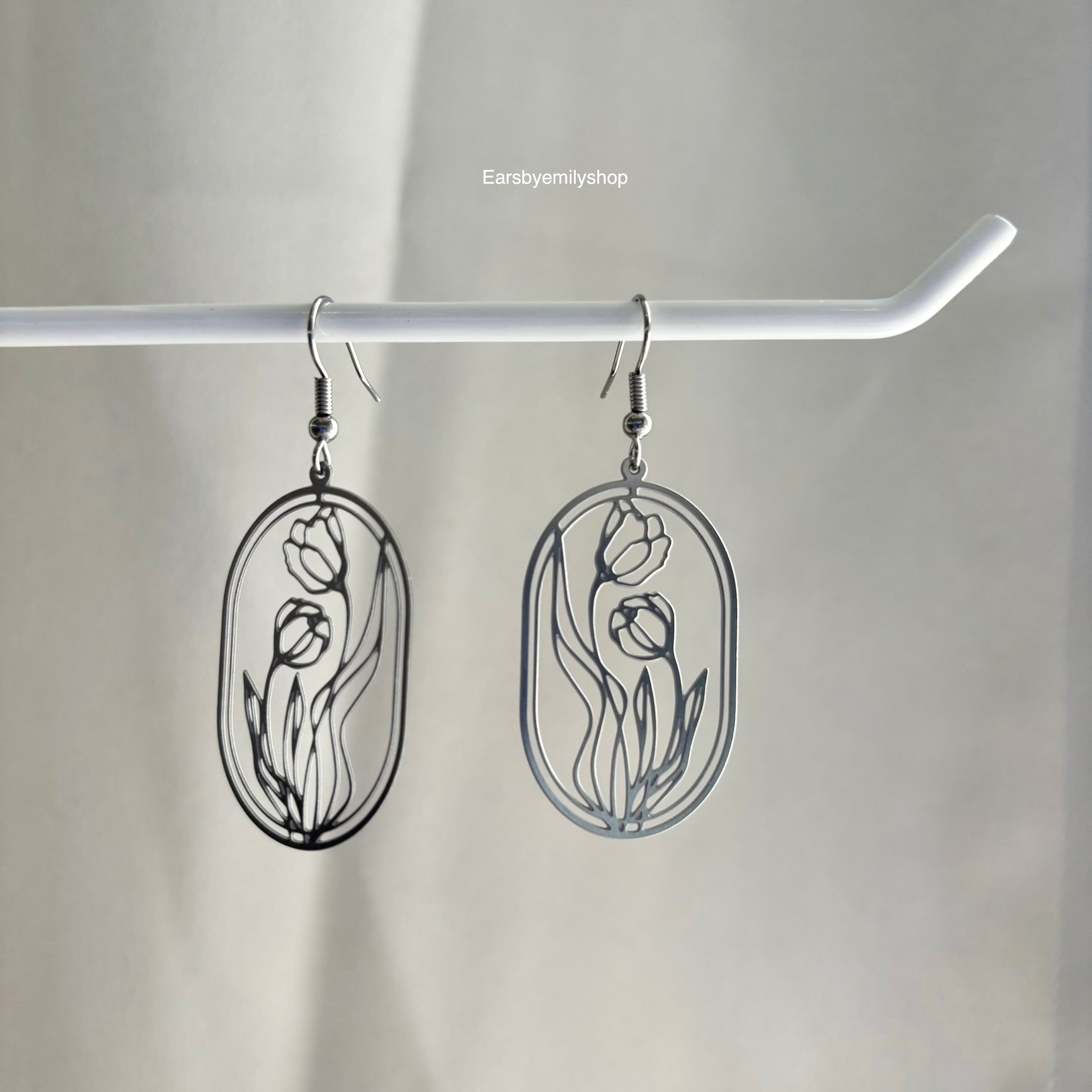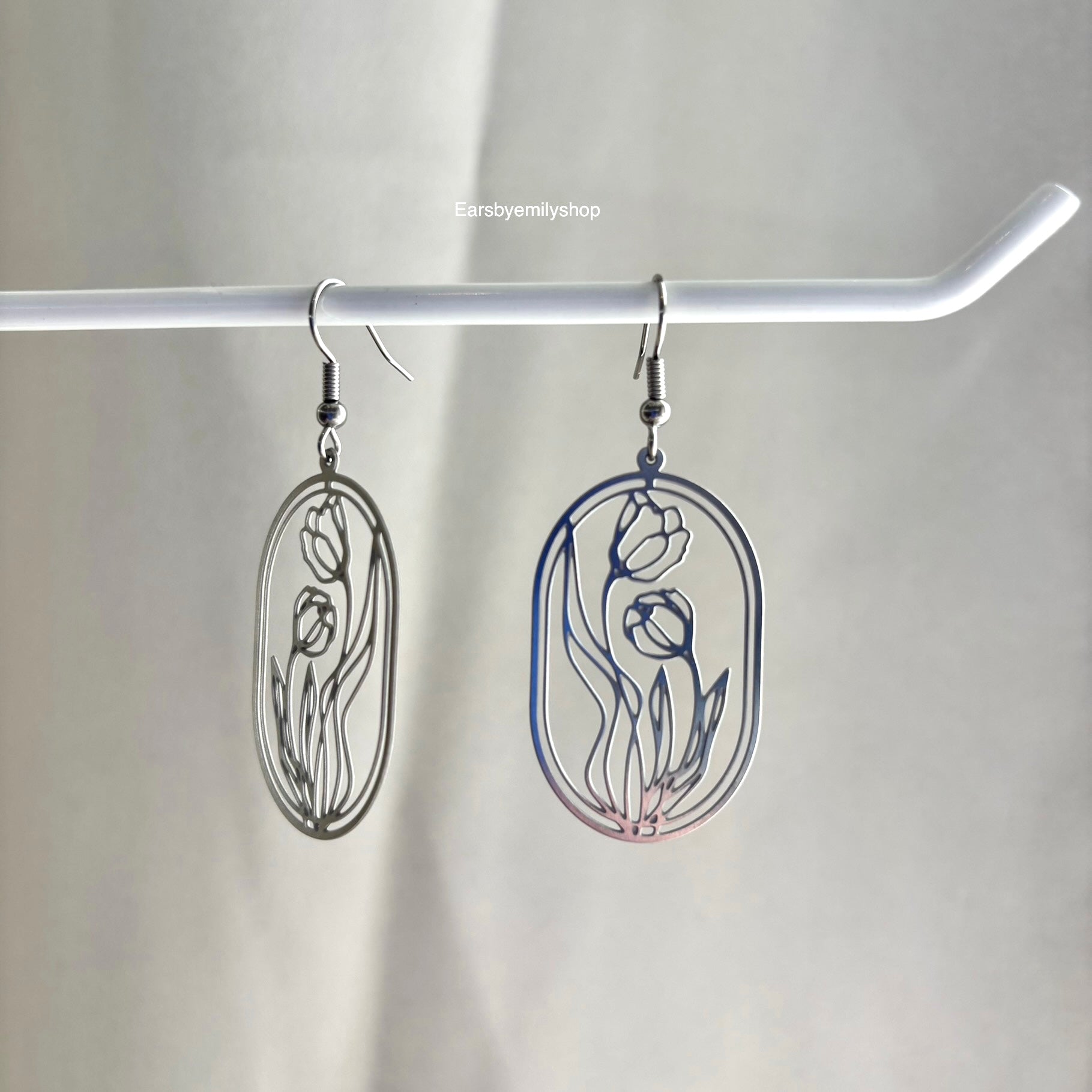 Add a fresh touch to your look with these charming stainless steel earrings! Their oval shape framed by sweet tulip flowers brings a fun, floral flair, while hypoallergenic surgical steel hooks keep your ears happy and comfy all day long. Perfect for brightening up any outfit with a playful twist!