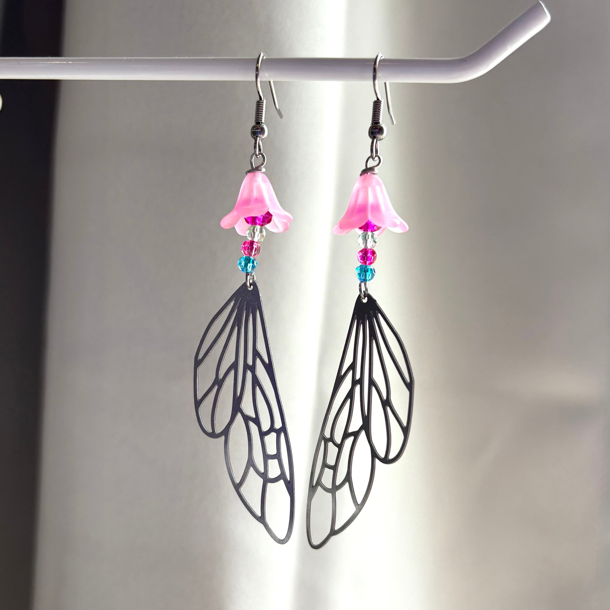 Stainless steel silver fairy wing dangle earrings with pink flowers and colourful beads