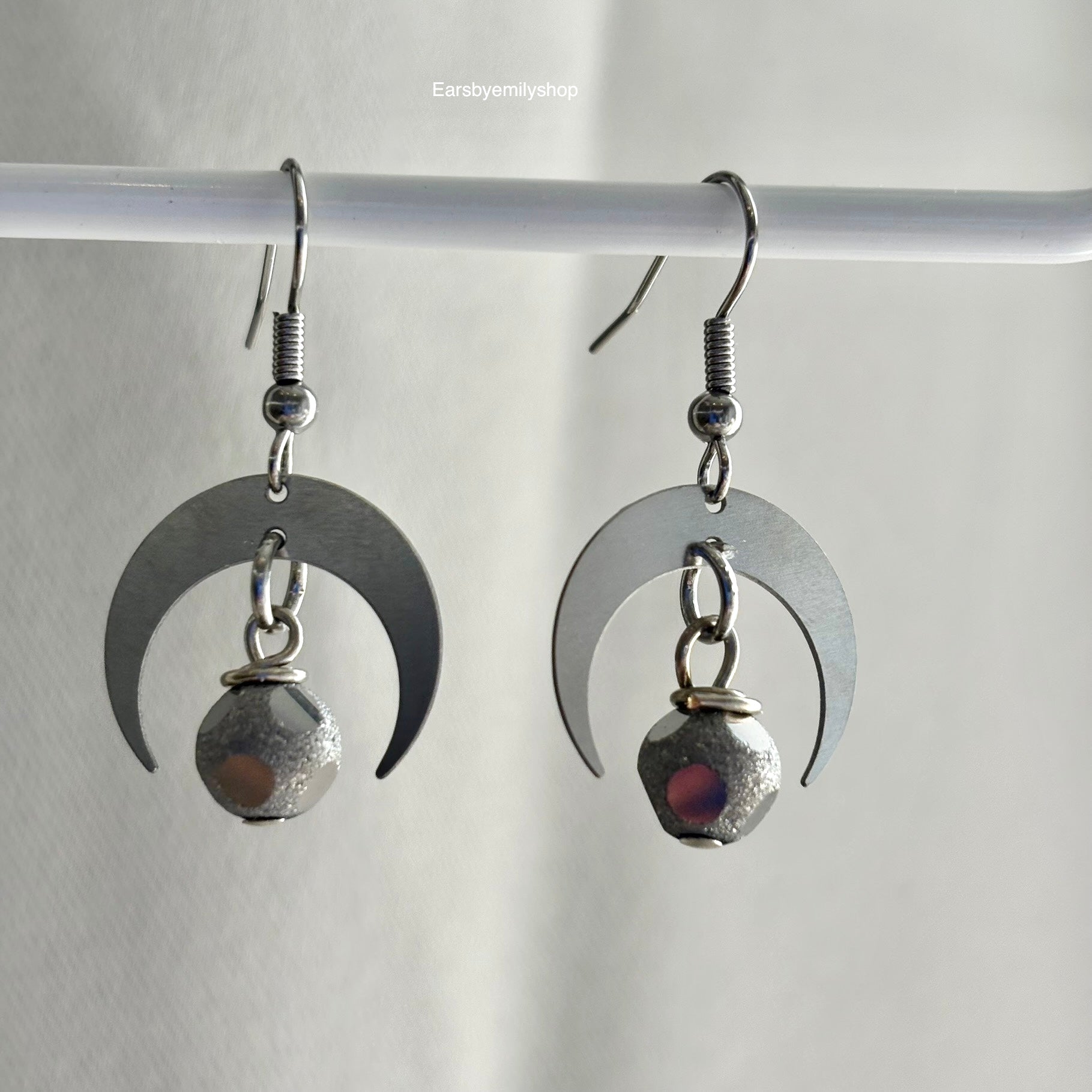 Add a touch of celestial fun to your outfit with our stainless steel dangle disco moon earrings. Featuring a silver moon and playful disco ball beads on hypoallergenic hooks, these earrings are perfect for anyone with sensitive ears. Shine on!
