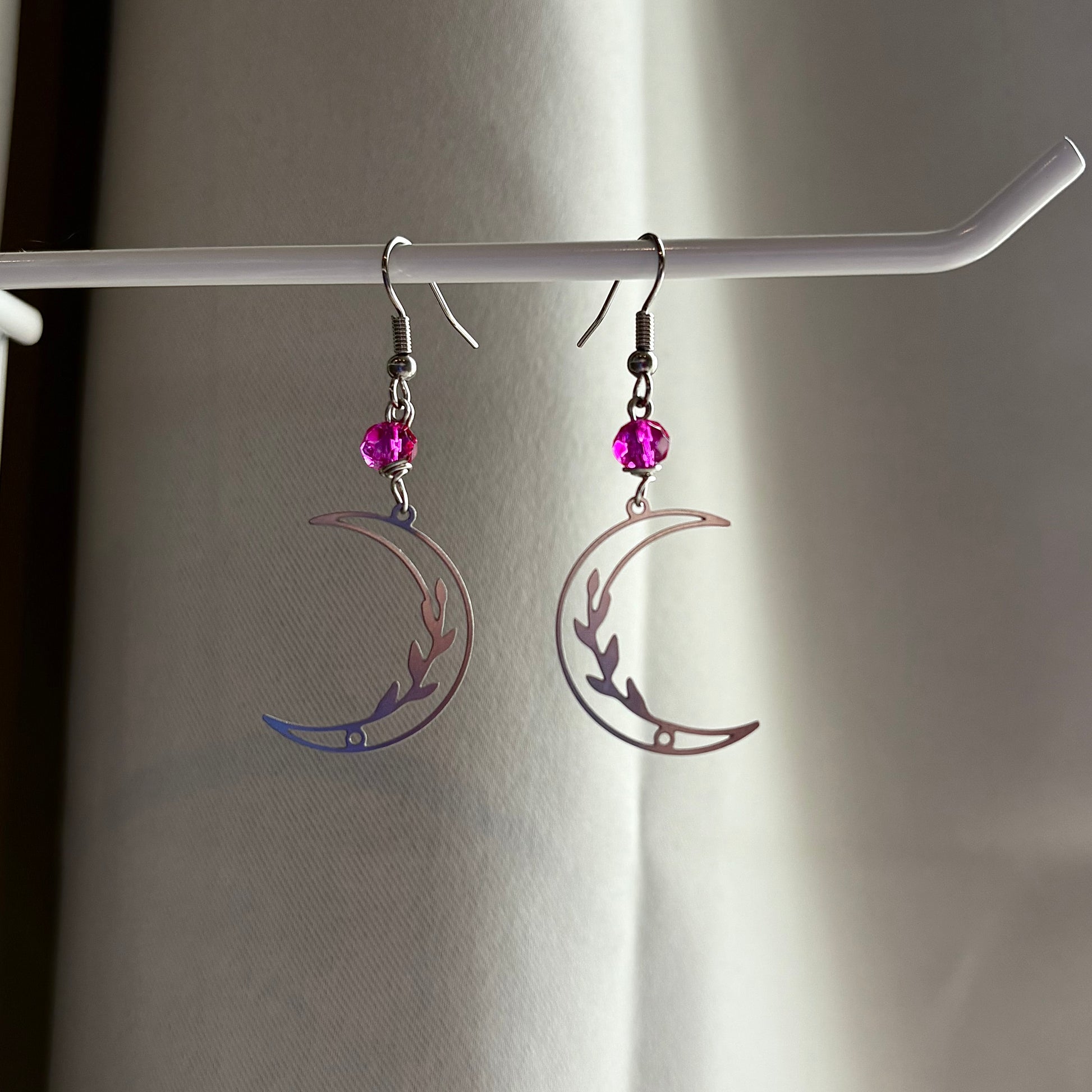 Add a touch of whimsy with these playful silver stainless steel moon earrings, delicately dangling from charming pink beads. Featuring hypoallergenic surgical steel hooks, they’re perfect for sensitive ears, combining style and comfort in one fun accessory.