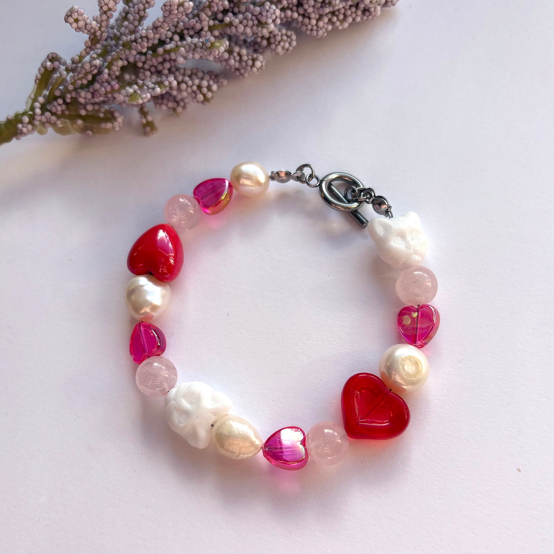 Add a bit of love to your look with our beaded "the lovers bracelet. This bracelet is handmade with baroque freshwater pearls, white cat charms and red hearts. Due to the natural nature of pearls, each bracelet is unique.